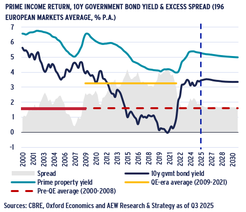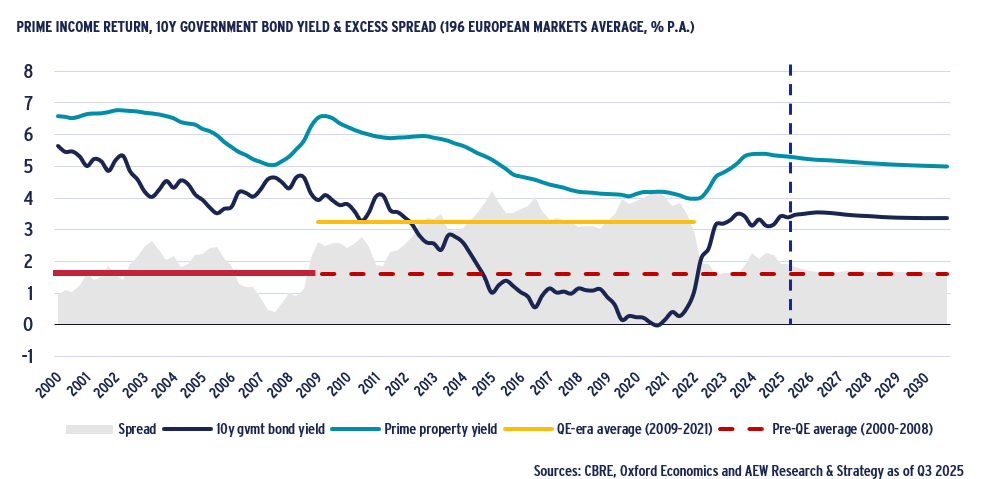 - The current excess spread of property yields over bond yields at 160 bps is projected to remain stable over the next five years.