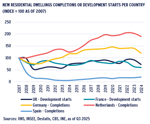 - While completions in Germany and the Netherlands have increased post-GFC, they still fall short of government targets.
