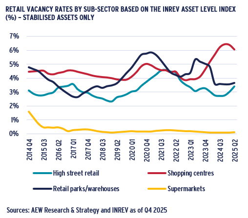 - Shopping centres and high street retail have projected 2026-30 rental growth of 1.6% and 1.2% p.a., respectively.