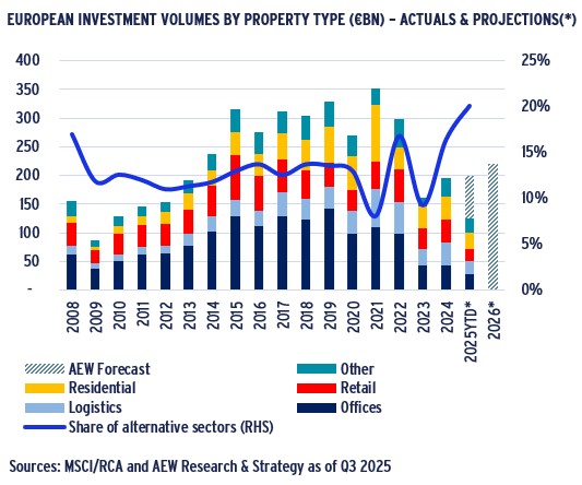 - Against this backdrop of improving fundamentals, 2025 European transaction volumes are projected at €200bn, up from €183bn in 2024. As bid-ask spreads narrow further we expect 2026 volumes at €215-225bn. Alternative sectors have expanded their share and are set for a new record of 20% of 2025 volumes.