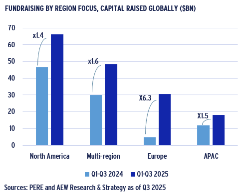 - This expectation is supported by the latest PERE data on real estate fundraising by targeted region, which highlights an interesting regional capital rotation on a global scale.