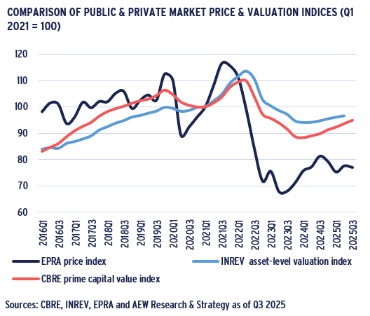 - Since mid-year 2023, REITs rebounded by 22% to Q3 2025 but have since slipped by 5% to Q3 2025.