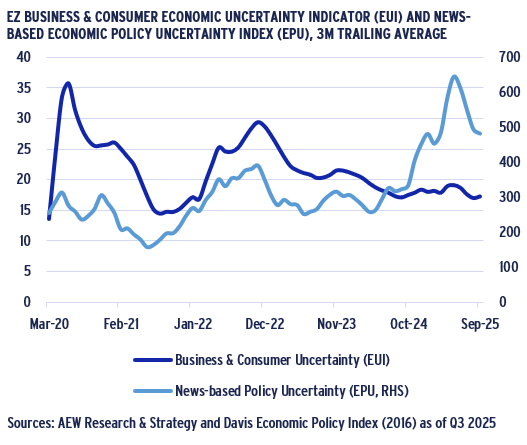 - EPU increased in 2022 on the back of inflation and rate hikes and peaked in Apr-25 after US tariff announcements.
