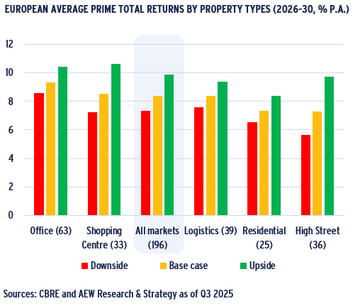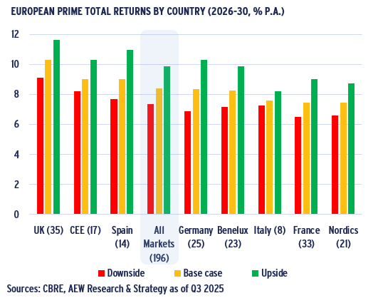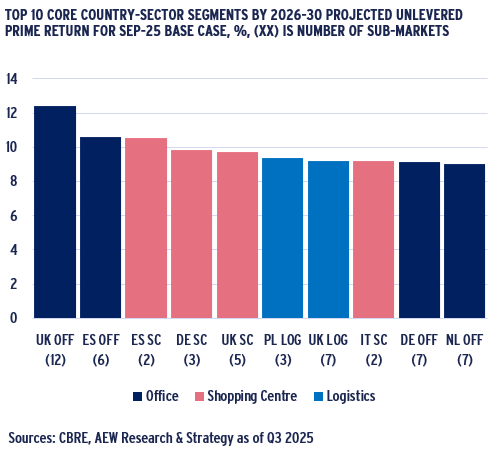 - If we look at our projected 2026-30 base case returns across countries and sectors, we note that UK offices offer the best returns at 12.4% p.a., followed by Spanish offices at 10.6% p.a.