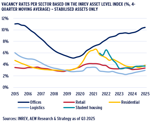 - Vacancy rates across European property sectors have been declining since the pandemic, with the notable exception of offices, as indicated by the INREV Asset Level Index (ALI).