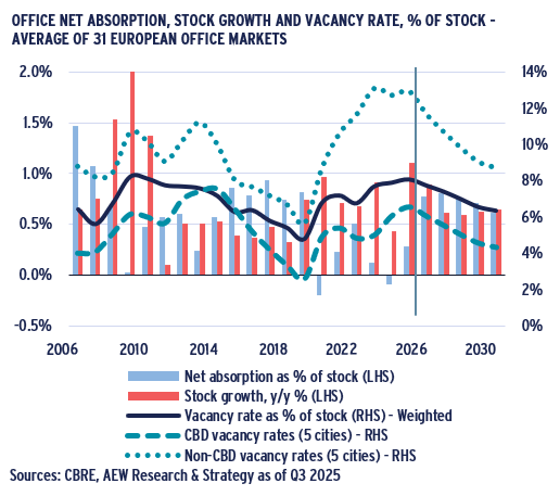 - Non-CBD vacancy peaked at nearly 13%, while CBD vacancy rates remained below 7% in 2025. Occupiers are struggling to find affordable CBD space, particularly in London and Paris.
