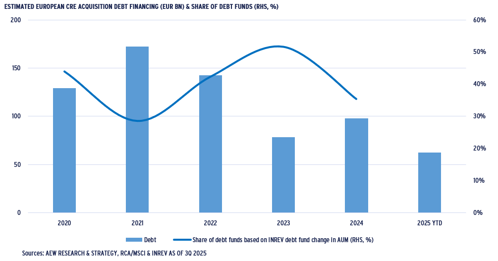 - As European transaction volumes recovered in 2024-25, acquisition-related debt origination was estimated at €98bn, a 26% increase from its 2023 low. Debt funds are gaining market share from traditionally dominant banks, as illustrated by 43 non-bank lenders estimated to have €110bn in European CRE debt AUM as of mid-year 2025.
