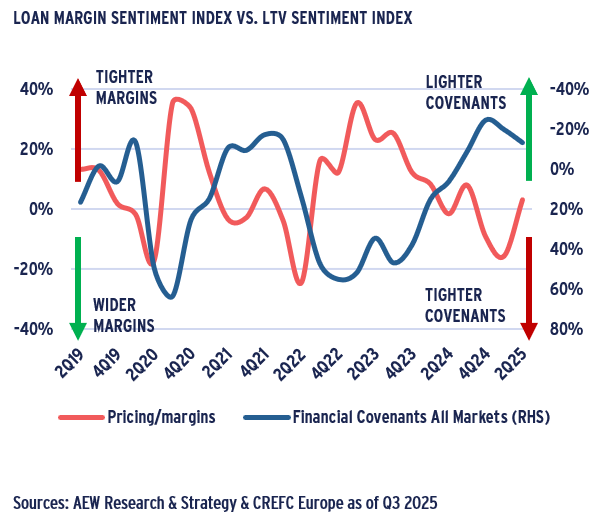 - Similarly, financial covenant restrictions (LTV and ICR) peaked in Q4 2022 at 55% and have since steadily eased to -13% in Q2 2025.