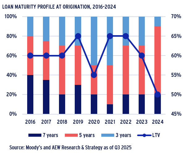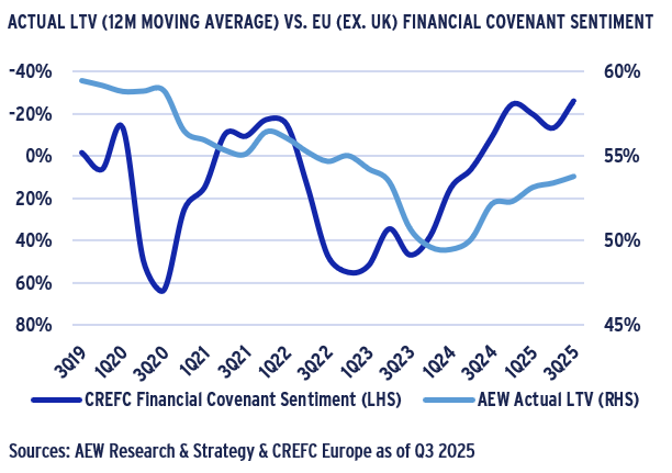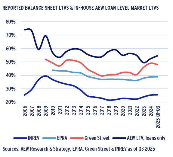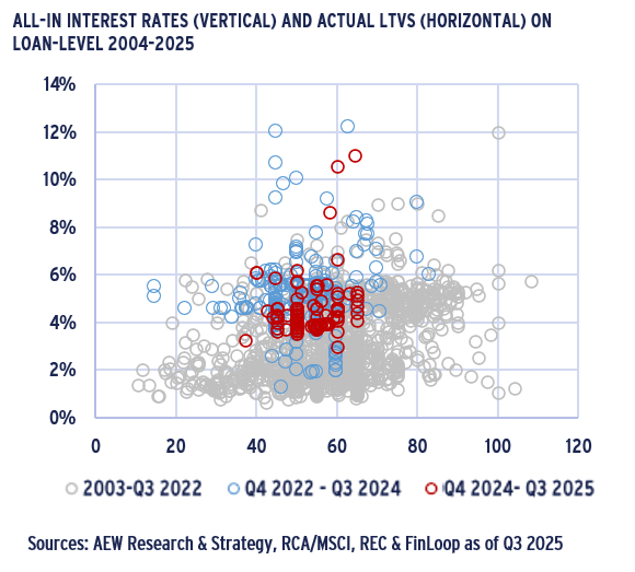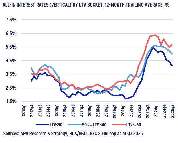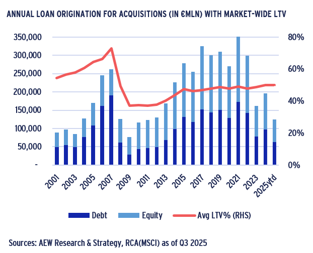 - Our in-house loan-level LTV market data shows an increase in Q3 2025 to 55% after a decline in 2024 to 50%. However, our loan level data disregards non-leveraged transactions.