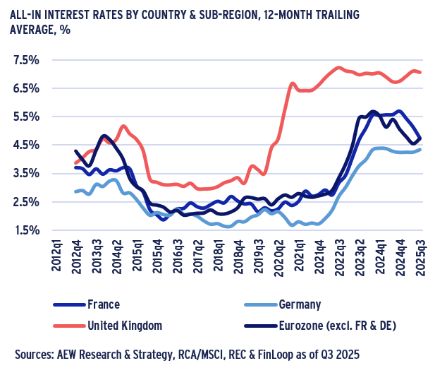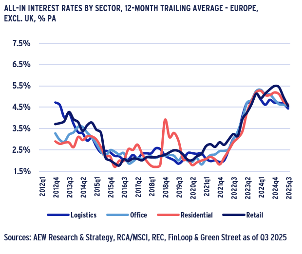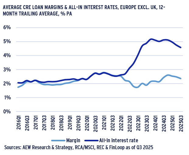 - Our granular loan-by-loan data confirms that all-in interest rates in Europe excl. UK tightened to 4.6% as of Q3 2025, down 60bps from its record high of 5.2% in Q2 2023.