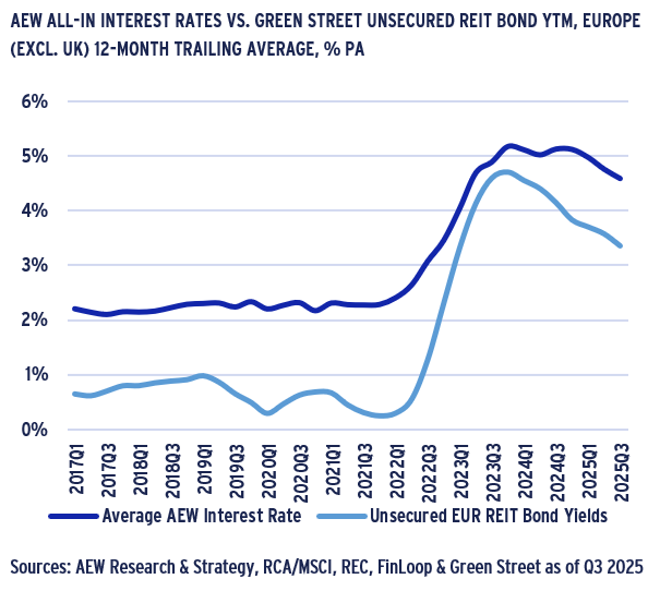 - Euro-denominated unsecured REIT bond yields in secondary trading tightened by 135 bps to 3.35% as of Q3 2025, down from their peak of 4.7% in Q4 2023.