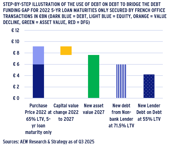 - However, debt-on-debt offers another solution. It allows for a non-bank lender to offer a refinancing at the new higher LTV without any new equity capital, as shown in the chart.