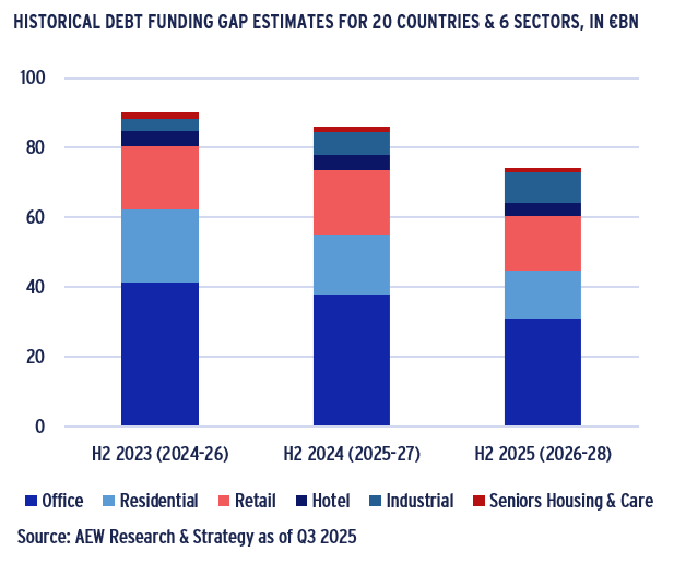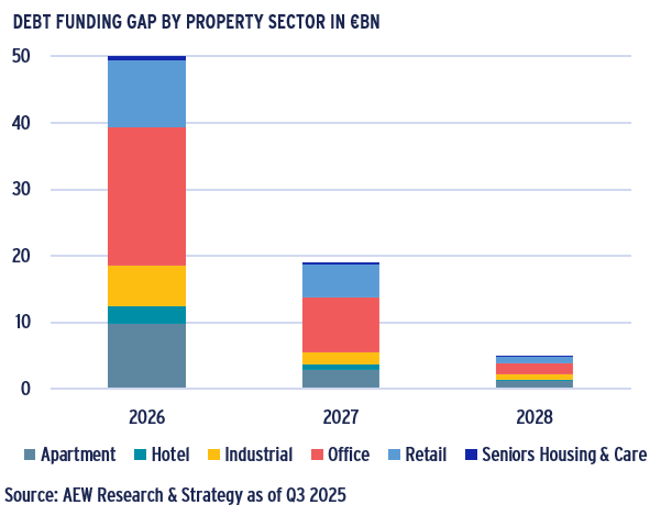 - As European capital values started stabilising since early 2025, many investors now ask whether the remaining refinancing challenge has sufficiently eased for market liquidity to return to more normal levels.