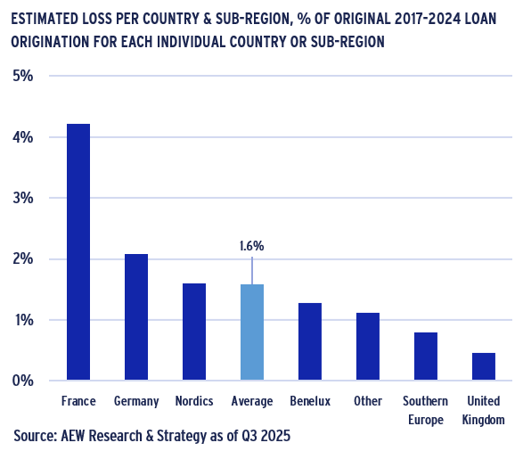 - On a country level, French loans are estimated to have worsened with a 4.2% loss, more than double the European average and up from 2% last year. This is due to a more pessimistic outlook on French capital values, particularly for logistics and offices, compared to last year’s projections.