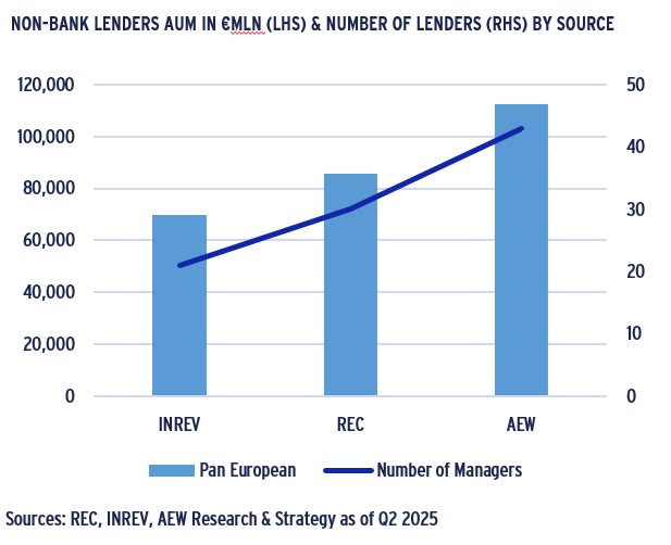 - Our estimate shows 43 different non-bank lenders with over €110bn in European CRE debt AUM as of mid-year 2025.