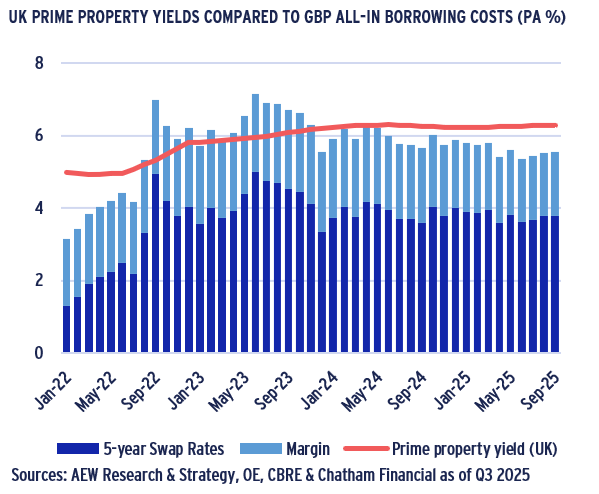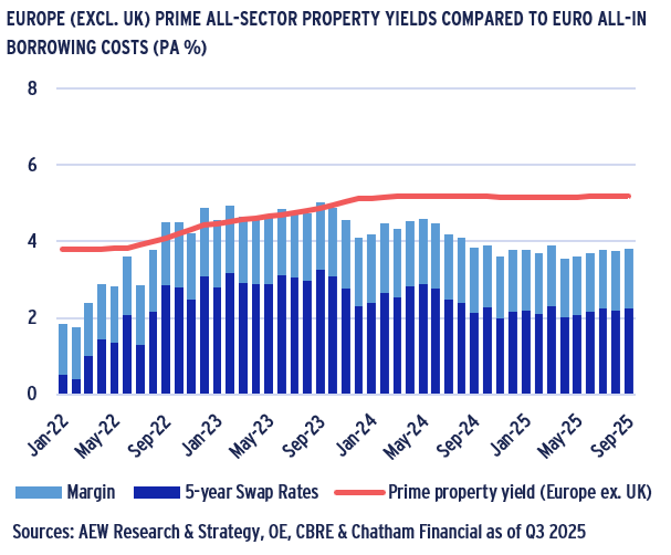 - Over the last year, all-in borrowing costs have broadly stabilized at accretive levels below prime yields. This is especially true in the Eurozone and to a lesser extent for the UK. Swap rates (and government bond yields ) in the UK remain elevated. UK loan margins have tightened in line with Eurozone loan margins – even for offices.