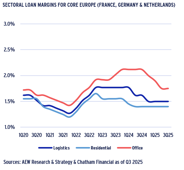 - As of Q3 2025 loan margins for Northern Europe stand at 175bps, 150bps, and 140bps for the office, logistics, and residential sectors, respectively.