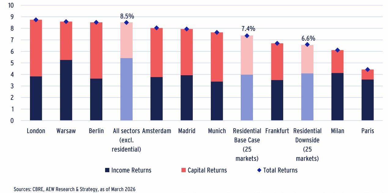 - If the conflict in the Middle East escalates further, leading to prolonged higher inflation and base rates – as assumed in our downside scenario – the projection for European residential total returns by a modest 80 bps lower than in the base case at 6.6% p.a..