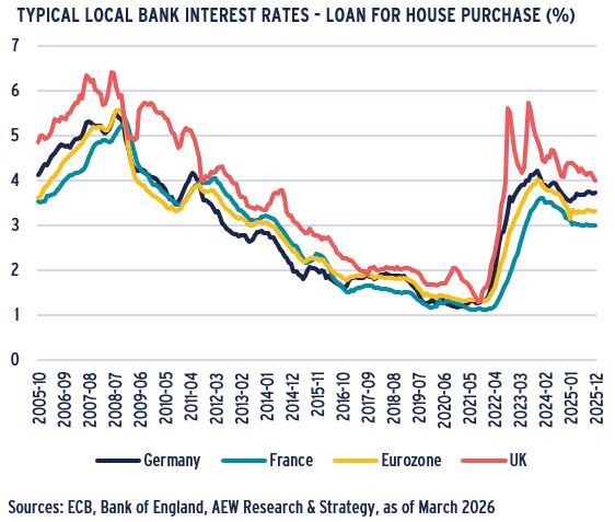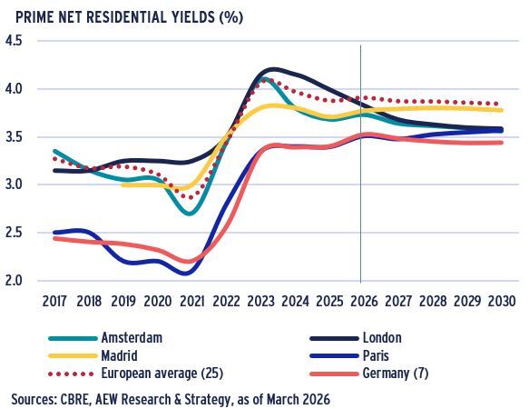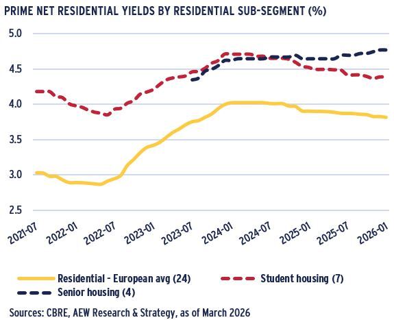 - From the second half of 2024, prime European residential yields have compressed, moving in by 30 bps from a peak of 4.1% to 3.8% at the start of 2026.