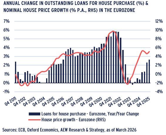 - House price growth in the Eurozone has gradually increased to over 5% in Q4 2025, after experiencing a modest decline in 2023 and starting its recovery in 2024.