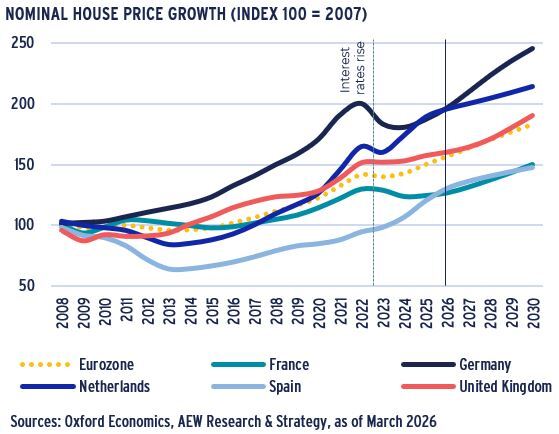 - Spain stands out in Europe with a lasting post-GFC impact. In addition, Spanish residential prices continued to increase by around 8% p.a. on average in 2022-25 despite higher interest rates.