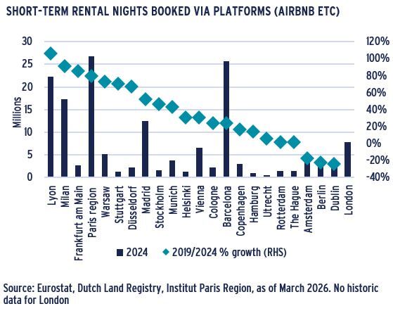 - Since 2019, short-term rental nights booked via platforms such as Airbnb have increased by more than 20% in most European cities. Over 70% increases have been recorded in Lyon, Milan, Frankfurt and Paris.