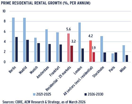 - Actual prime residential rental growth of 3.3% in 2025 in Europe was slightly weaker than the 2021-25 average of 5.6% p.a.. due to lower inflation.