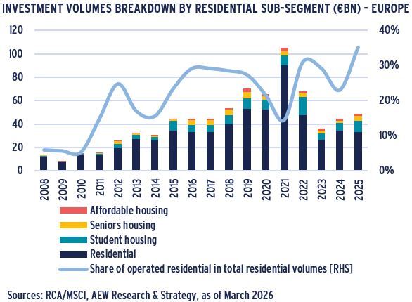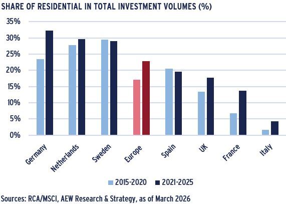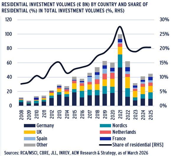- Over the last fifteen years, residential has doubled its market share of total volumes invested in European property from 8% in 2008 to 21% in 2025.