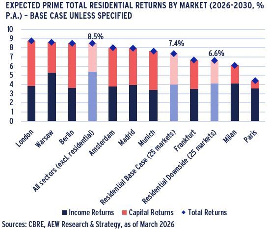 - As shown below, 2026-30 European residential total returns are projected at 7.4% p.a. in the base case, driven mostly by current income (4.0% p.a.) and capital return from rental growth, with limited capital return coming from yield compression.