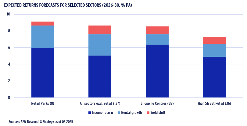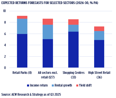 - In terms of projected 2026–30 returns, retail park returns are 9.2% p.a., exceeding our projected 8.7% p.a. for non-retail sectors, while shopping centres and high street retail trails behind at 8.6% and 7.3% p.a., respectively. Projected retail capital returns are more moderate than for non-retail, emphasising their focus on current income.
