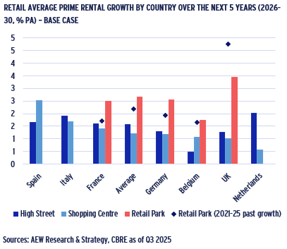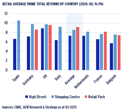 - Across the three main European retail sub-sectors 2026-30 returns are projected to average between 7.2%, 8.6% and 9.1% p.a. for HSR, SC and RP, respectively.