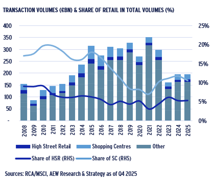 - Transaction volumes for European retail came in at €31bn in 2025 still well below their €78bn peak in 2015. Concerns about e-commerce and interest rates drove a significant repricing. However, a recovery is now emerging as the share of retail within total transaction volumes has recovered to 16% in 2025 from a low of 10% in 2021.
