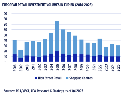 - Despite increasing share in total volumes, 2025 European shopping center volumes of €21bn were slightly below their 5-year historical average of €23bn.