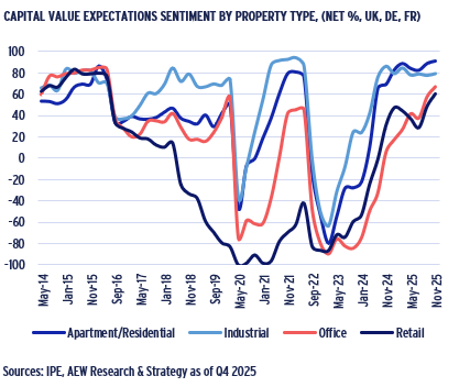 - In fact, 2024-25 showed a strong improvement in European managers’ sentiment across all sectors based on the latest IPE Real Assets Expectations Indicator survey.