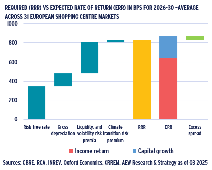 - For the 31 European shopping centre markets included in this relative value analysis, the 2026–30 average RRR is projected at 8.33% p.a. and ERR is estimated at 8.66% p.a.
