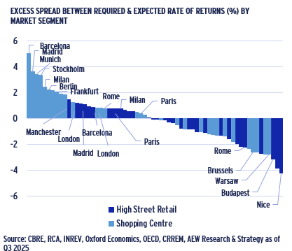 - Nice, Budapest, and Rome high street are among the outliers on the negative excess-spread side, together with Warsaw and Brussels shopping centres.
