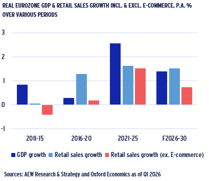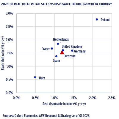 - 2026–30 real retail sales are expected to grow at 1.5% p.a. and 1.6% p.a. in the Eurozone and in the UK, respectively.