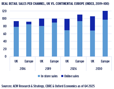 - Online sales are expected to grow by 6% p.a. in the UK and 8% p.a. in the rest of Europe for the 2026–30 period.