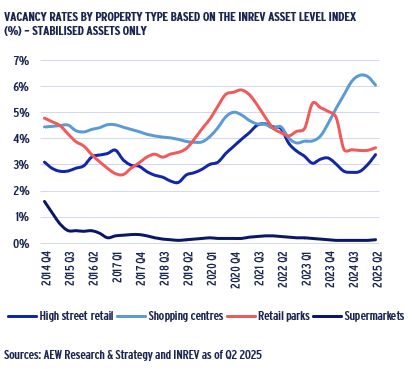 - Retail vacancy rates have moderated in varying degrees across sub-sectors from their 2020–21 COVID-related highs, with shopping centre vacancy at 6%, high street retail at 4%, and retail parks at 4% for Q2 2025.