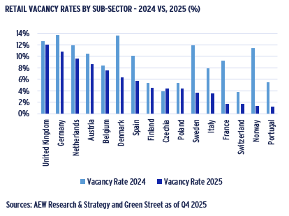 - In 2025, vacancy rates across European markets ranged from 1% to 12% based on the latest Green Street data.