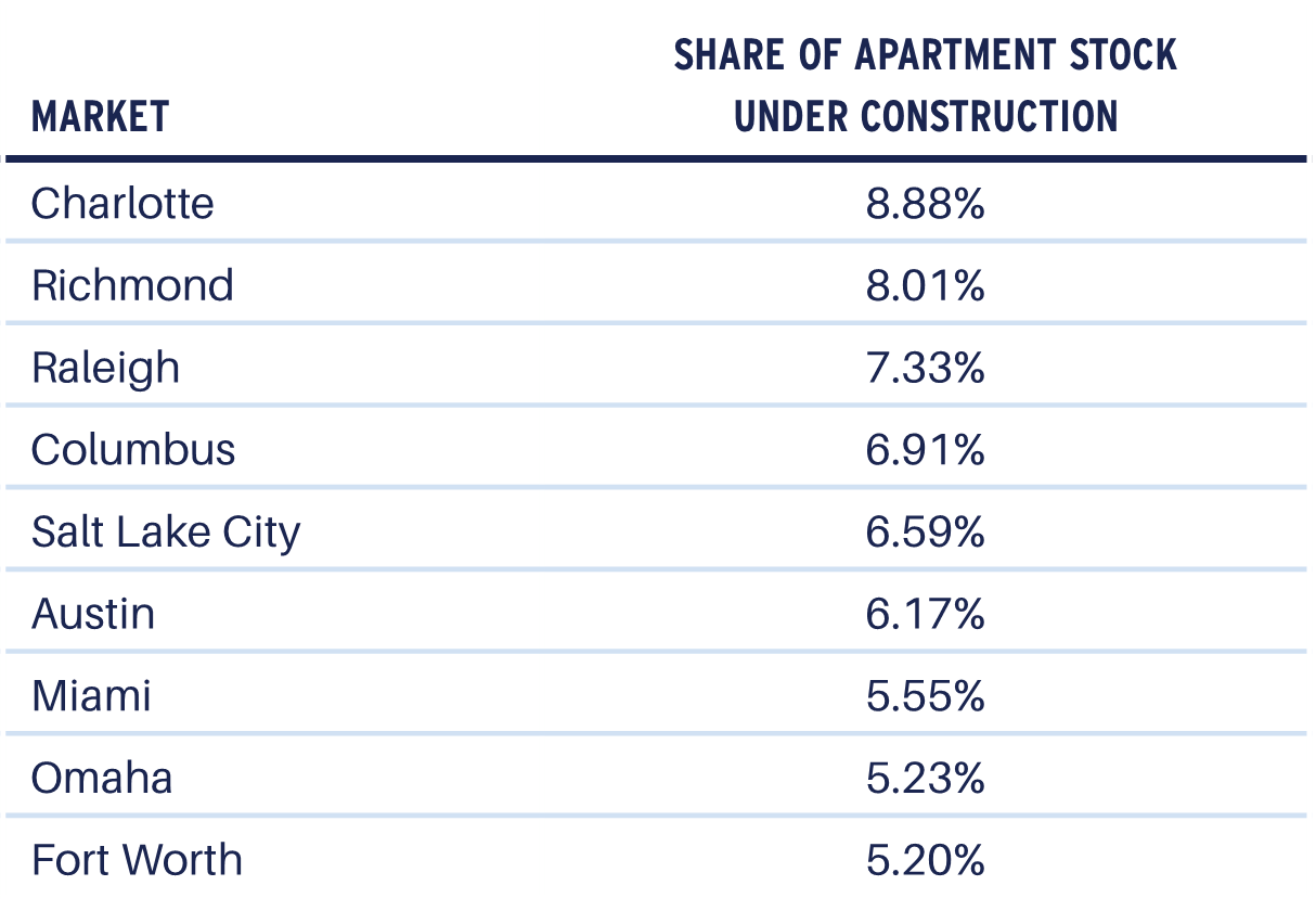 APARTMENT MARKETS WITH 5% OR MORE OF STOCK CURRENTLY UNDER CONSTRUCTION