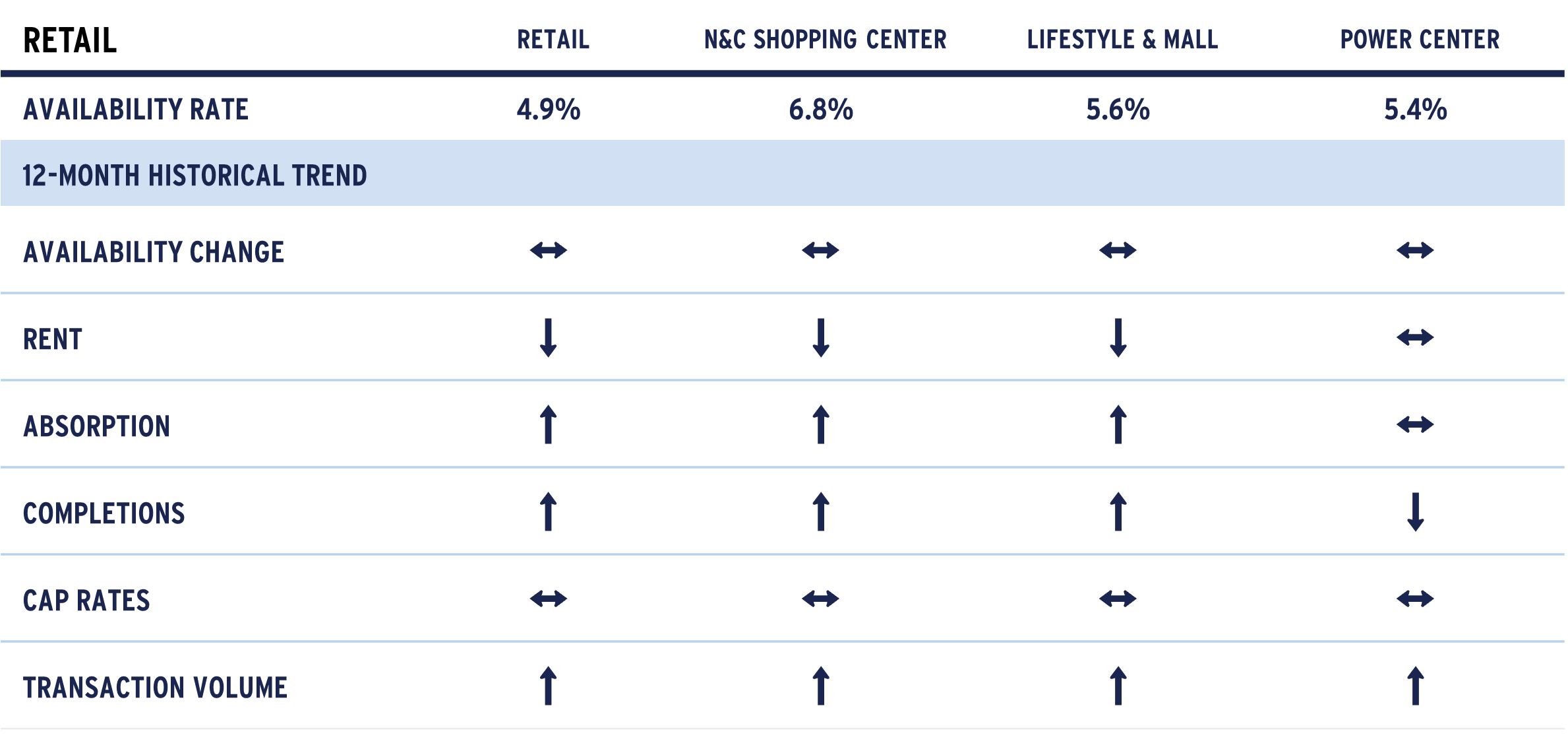 The modest increase in availability has tempered rent growth, giving retailers slightly more leverage. However, the sector’s structural undersupply, stemming from a decade of limited development, continues to support healthy fundamentals. Many shuttered stores have been replaced by discount grocers, fitness centers and entertainment venues, keeping occupancy high. Grocery-anchored neighborhood centers are especially tight, while some Class B malls and power centers contribute to localized vacancies, often addressed through redevelopment.