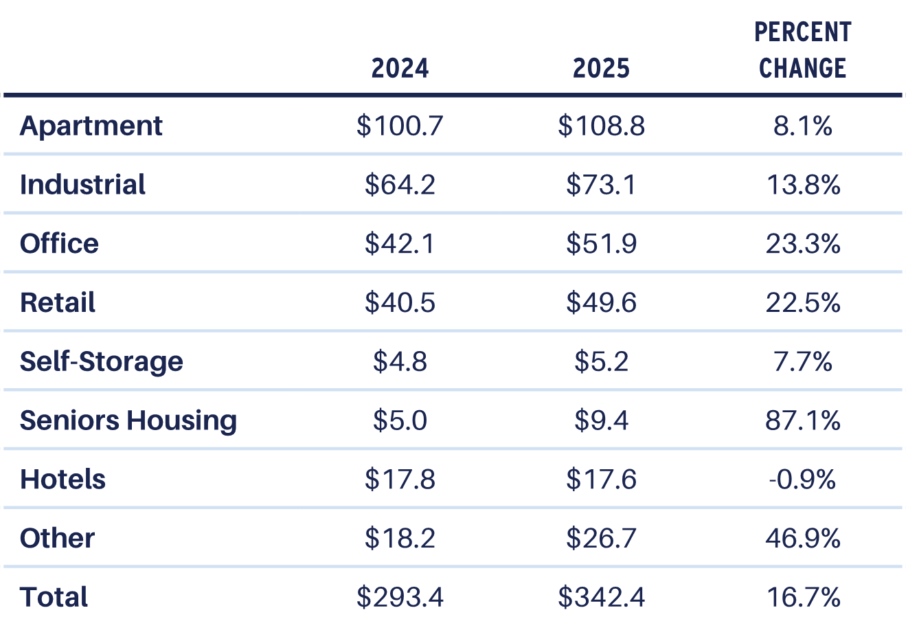 Aggregate commercial property transaction volume has improved considerably throughout the year and, as of the end of Q3, is running more than 15% ahead of last year’s pace. Volume in all property sectors except hotel is above year-ago pacing and seniors housing is likely to finish the year at nearly twice the total volume of 2024, albeit still a relatively small aggregate dollar level given the comparative size of the sector.